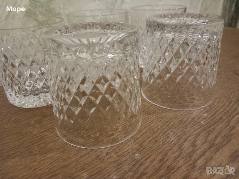 Пет кристални чаши за уиски с височина 8 см. диаметър на отвора 7,5 см. с много красиви ромбове. Отлично състояние без забележки. Изпращам с Еконт и Спиди, за София предпочитам лично предаване.