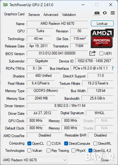 Model: AMD Radeon Gigabyte HD R6670