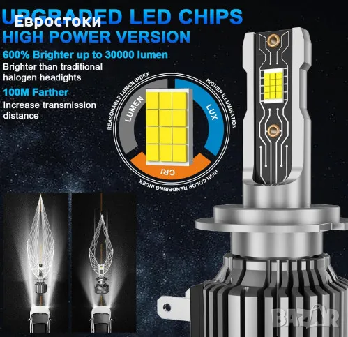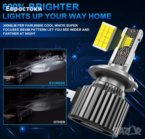 Нова конфигурация с 24 LED чипа. Sycreek LED крушки за фарове H7 използват персонализирани двустранни LED чипове, 12 бр. 3570, 600% по-ярки - до 30000LM, 150W 6500K студено бяло. Концентрираният лъч достига научната оптична система, осигурявайки ярка и ясна светлина. Широката и ясна визия гарантира безопасност по време на нощно шофиране.