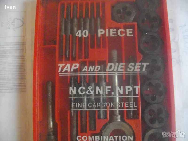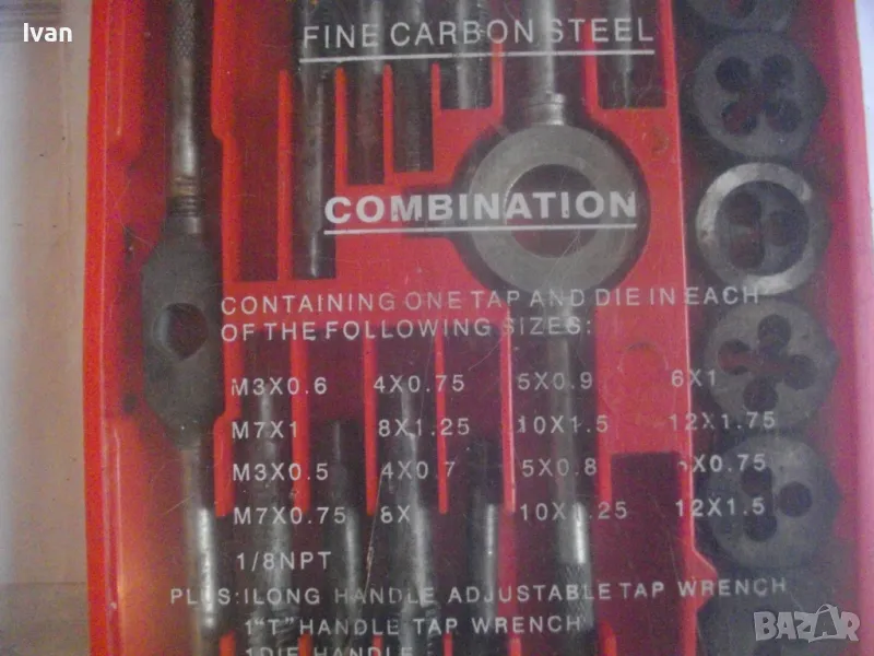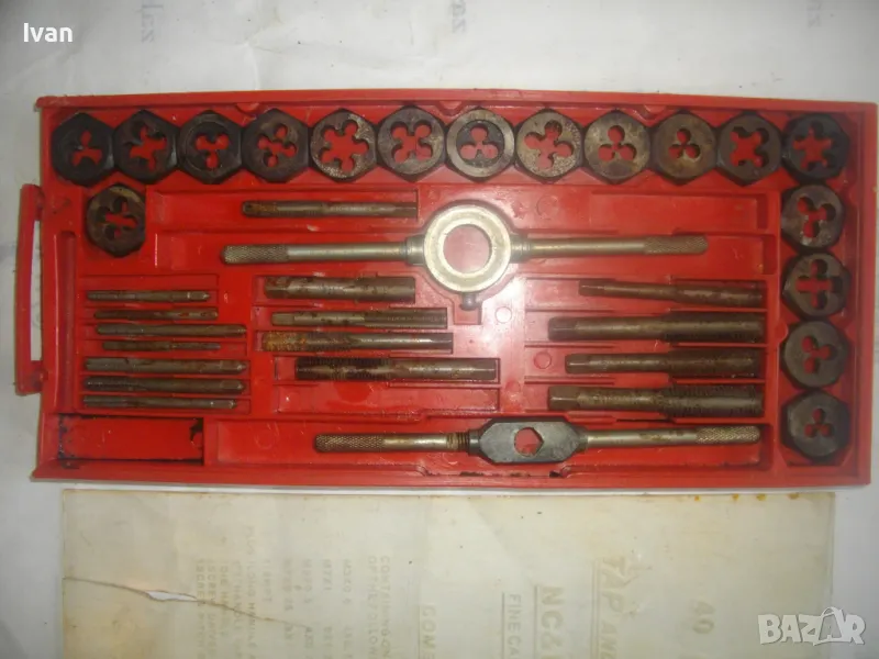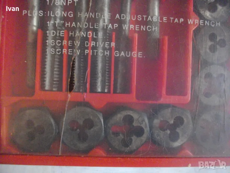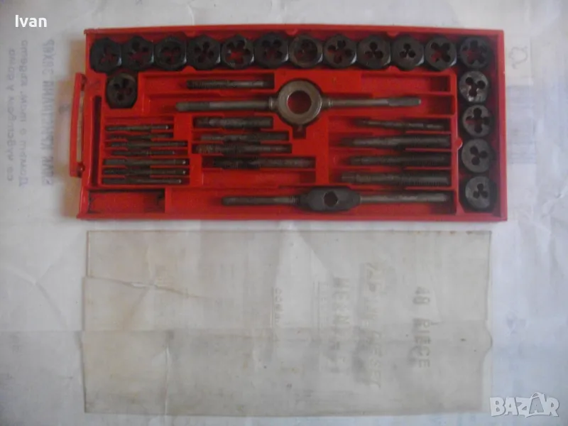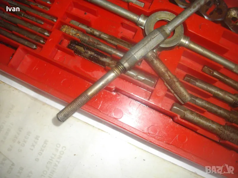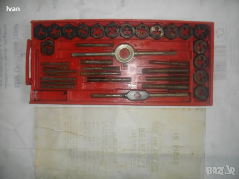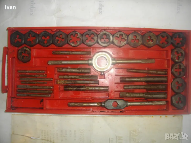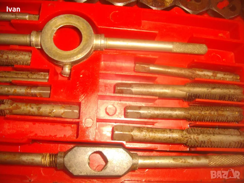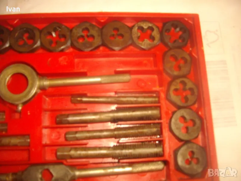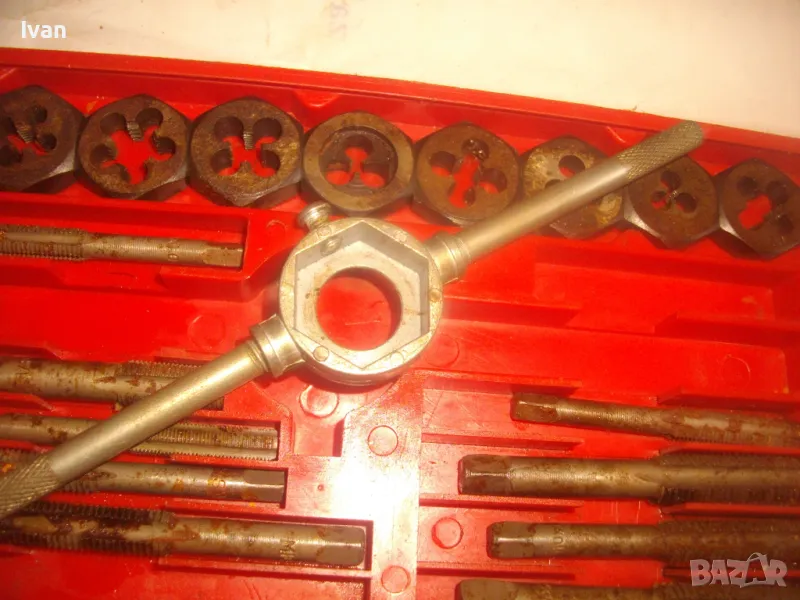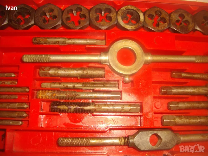 Цена на голям червен комплект 35 бр. плашки и метчици за външни/вътрешни резби до М12 - 99 лв. ОПИСАНИЕ на червен голям комплект 35 части - 129 лв. Не е упоменато производство, предполагам немско или френско. Размерите са упоменати да лицевата част на кутията. До размер резби М12. Общо 35 бр. компоненти /държачи, плашки, метчици/. Някои са ползани леко, други са съвсем нови. Всички части са от карбон.Кутията е пластмасова, с прозрачно лице, здрава и се затваря и заключва добре. Размери кутия - 320 х 145 х 25 мм. Тегло - приблизително 1,5 кг.