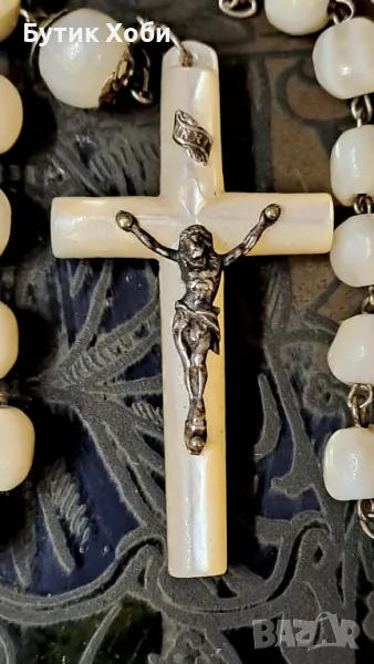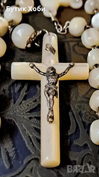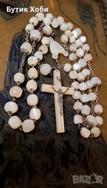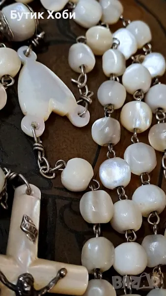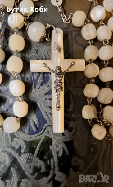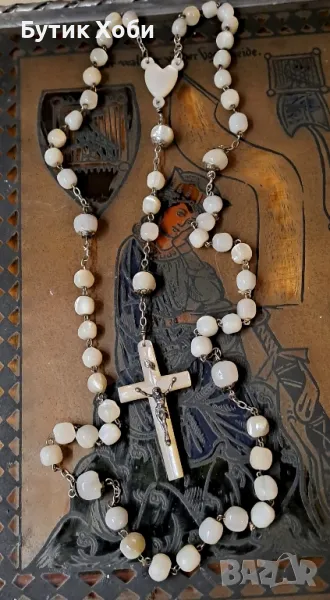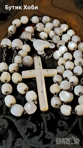 Уникална седефена католическа броеница - дълга е и с големи елементи ! Изцяло ръчна изработка, перфектно запазена, без липси и наранявания. Зърната са ,,греещи,, отвътре, което е показателно за стария седеф. Дължина - 75см +16см; кръст ( седеф) - 6×2,7см. Зърна - от 0,7 до 1см.