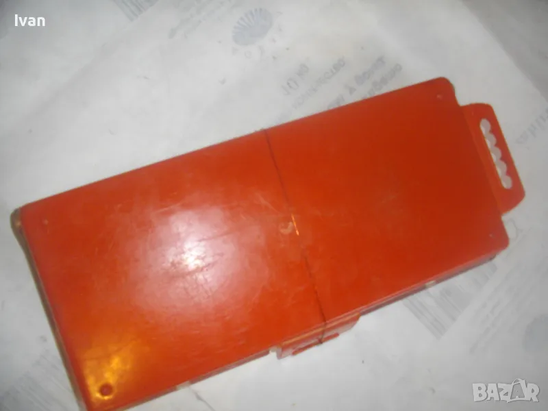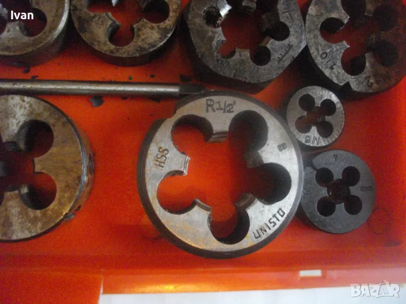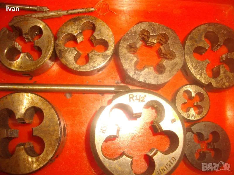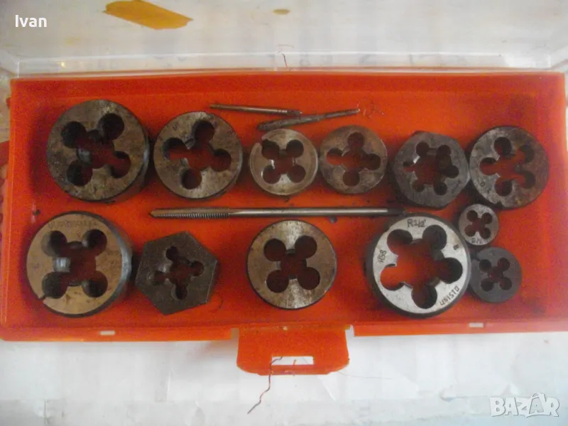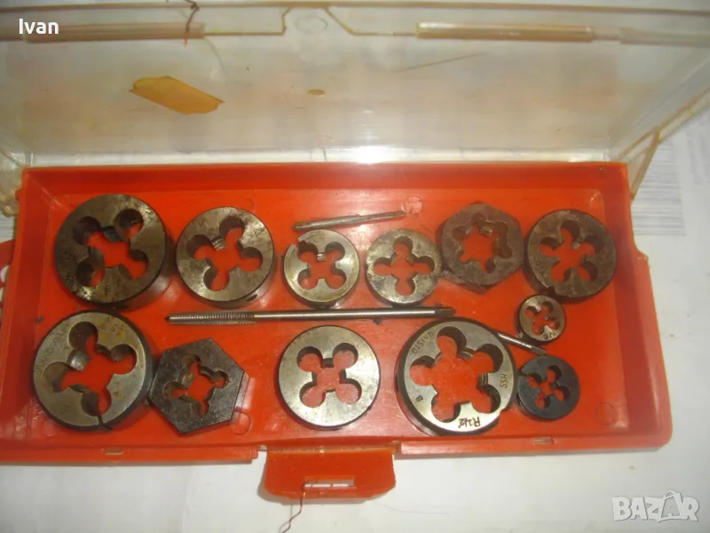 ОПИСАНИЕ на кутия малка червена с 12 бр. големи плашки и 3 бр. метчици - цена 199 лв. Не е упоменато произовдство, предполагам немско или френско. Някои са малко ползвани, други са съвсем нови. Маркови, четат се марки DISTIN, Westfellia, TITAN и др. Плашките са 12 бр общо,размери : М 16 HSS, M 12 , 1/2 , 5/8 , М10 и др. Размери на кутията /пластмасовас прозрачно лице от плексиглас/ - 250 х 11 х 40 мм. Закопчалката на кутията е счупена, но кутията е здрава.