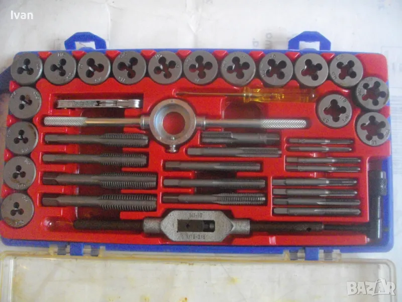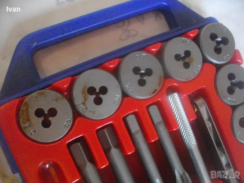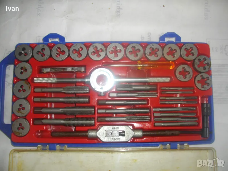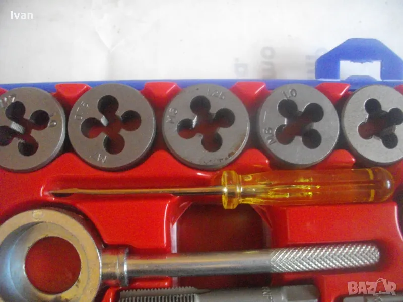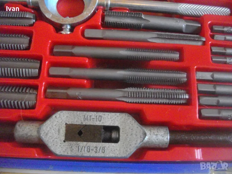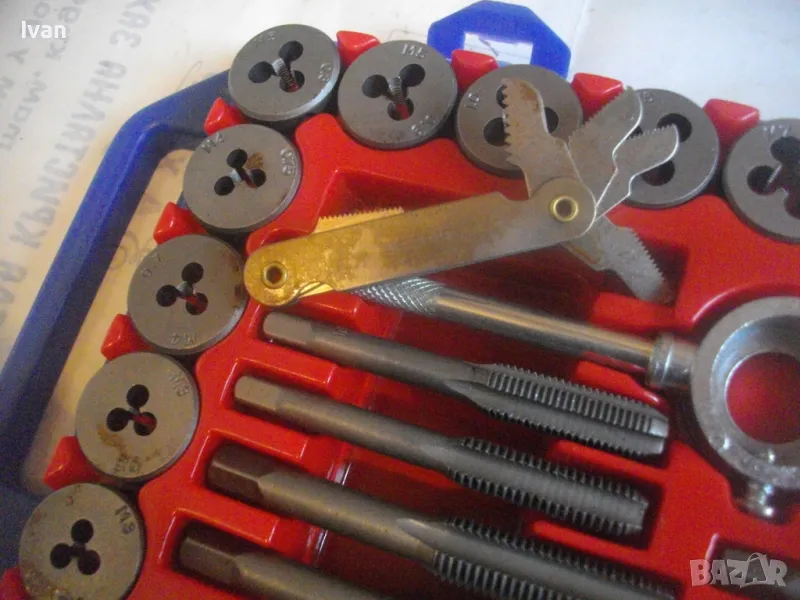ОПИСАНИЕ на комплект резбоназерни матчици и плашки за външни и вътрешни резби в червена кутия. Немски оригинален, старо професионално качество, което в съвремието липсва. Нов, неизползван. 129 лв. Включва 17 бр. плашки от М 3 до М 12, 17 броя метчици различни, 1 б. отвертка права малка, луфтомер метален двустранен, държач 1 бр. за метчици размер М 1 - М 10, с дръжки, държач 1 бр. за плашки, с дръжки. Комплектът е в оригинална пластмасова кутия, с прозрачно лице и вложка за отделните компоненти. Закопчалки и ръжка за носене вградена в пълна изправност.