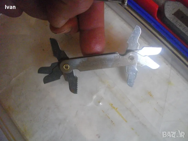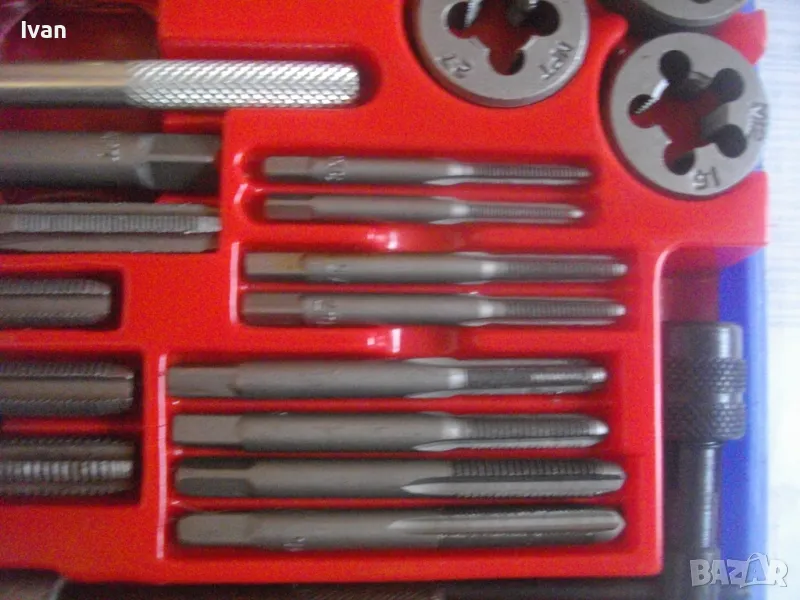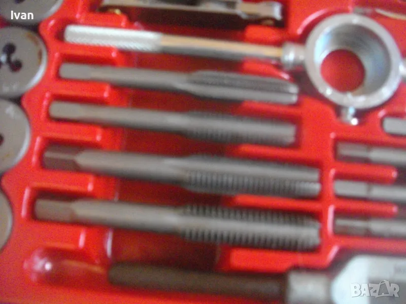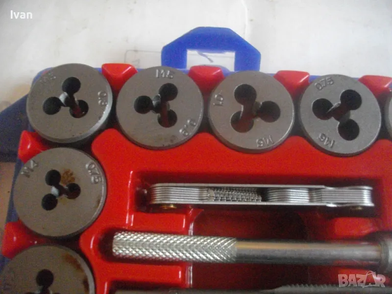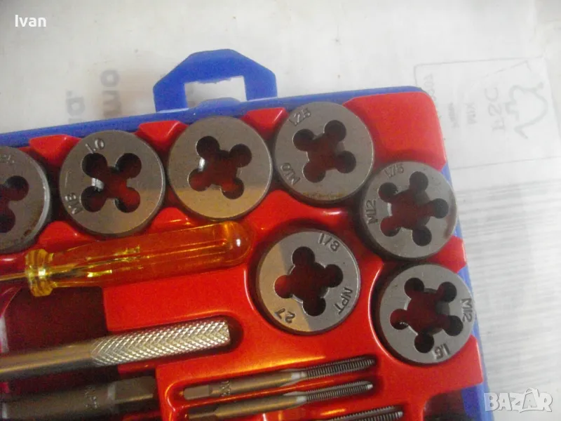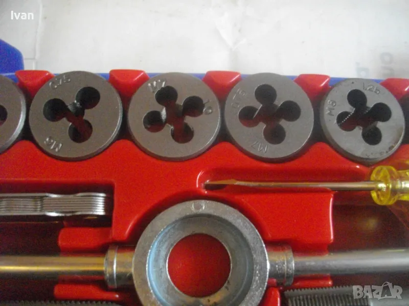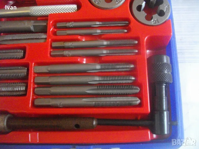 ОПИСАНИЕ на комплект резбоназерни матчици и плашки за външни и вътрешни резби в червена кутия. Немски оригинален, старо професионално качество, което в съвремието липсва. Нов, неизползван. 129 лв. Включва 17 бр. плашки от М 3 до М 12, 17 броя метчици различни, 1 б. отвертка права малка, луфтомер метален двустранен, държач 1 бр. за метчици размер М 1 - М 10, с дръжки, държач 1 бр. за плашки, с дръжки. Комплектът е в оригинална пластмасова кутия, с прозрачно лице и вложка за отделните компоненти. Закопчалки и ръжка за носене вградена в пълна изправност.