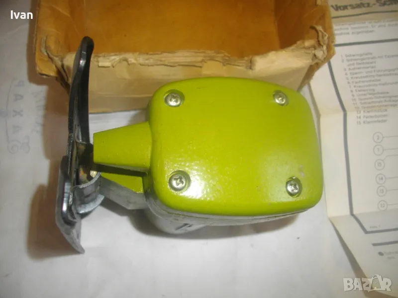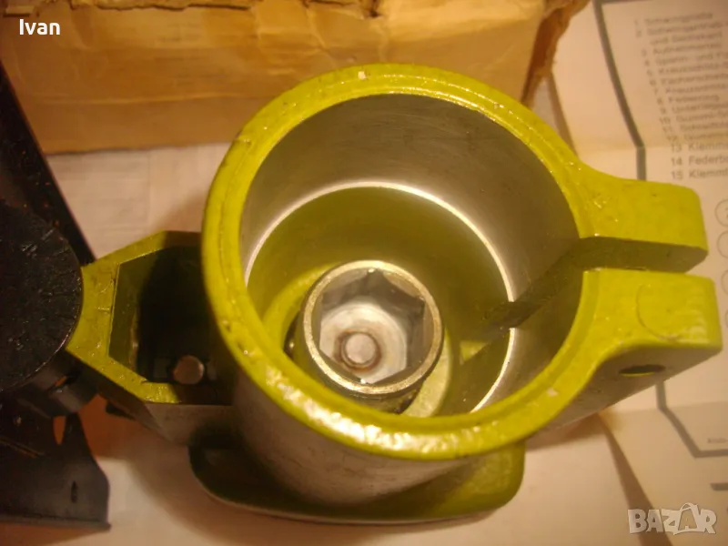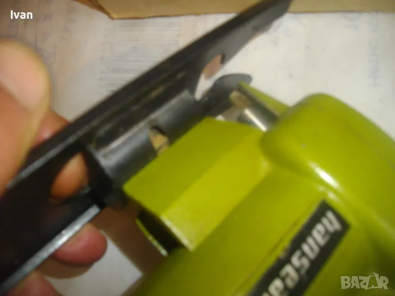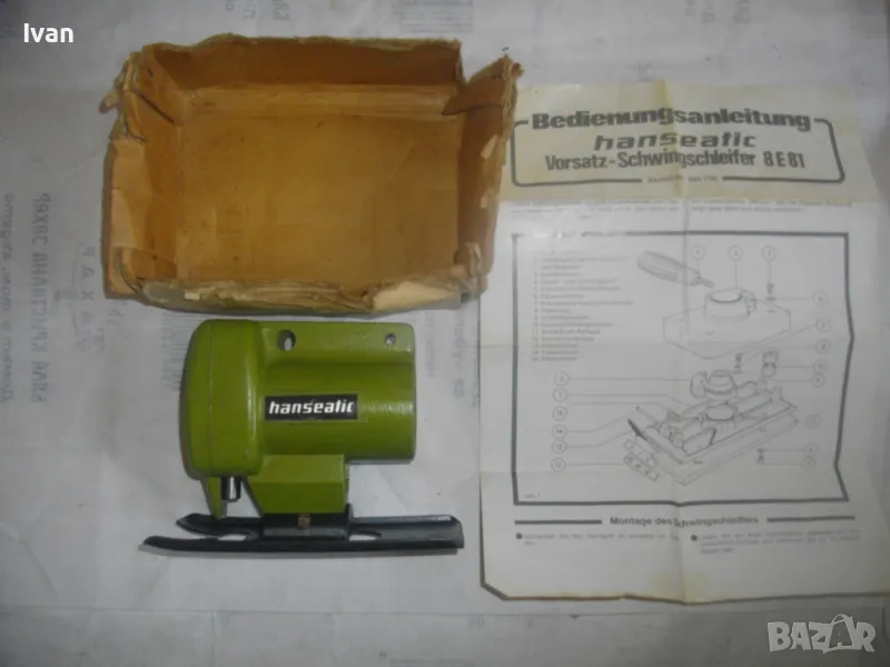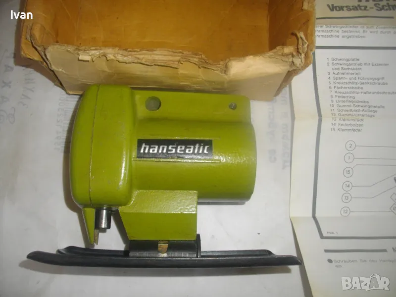 Описание на светло зелена приставка зеге - немска - марка Hanseatic. Съвсем нова приставка вертикален прободен трион-зеге,за бормашина-дрелка или машини с патронник,който има възможност да се снема.Приставката е универсална,за всички бормашини,посредством съединител към оста.Марка на приставката-Hanseatic.Немско оригинално производство.Професионален модел-изцяло масивна,метална,от дебело желязо,без пластмасови части.Наклон на плота-0-45 градуса.За стандартни Т и U образни режещи ножчета-триони.Захват на приставката към бормашина-втулка шестенна,вградена,която се вкарва посредством адаптор или гумен съединител към бормашината.Адаптора не е вкючен към приставката.Приставката е без ножче.В оригиналната си картонена кутия.