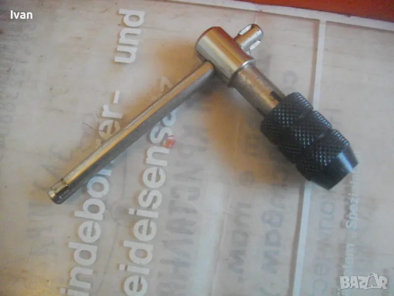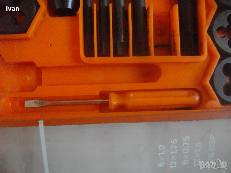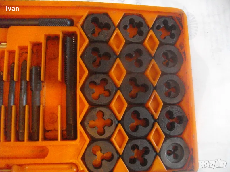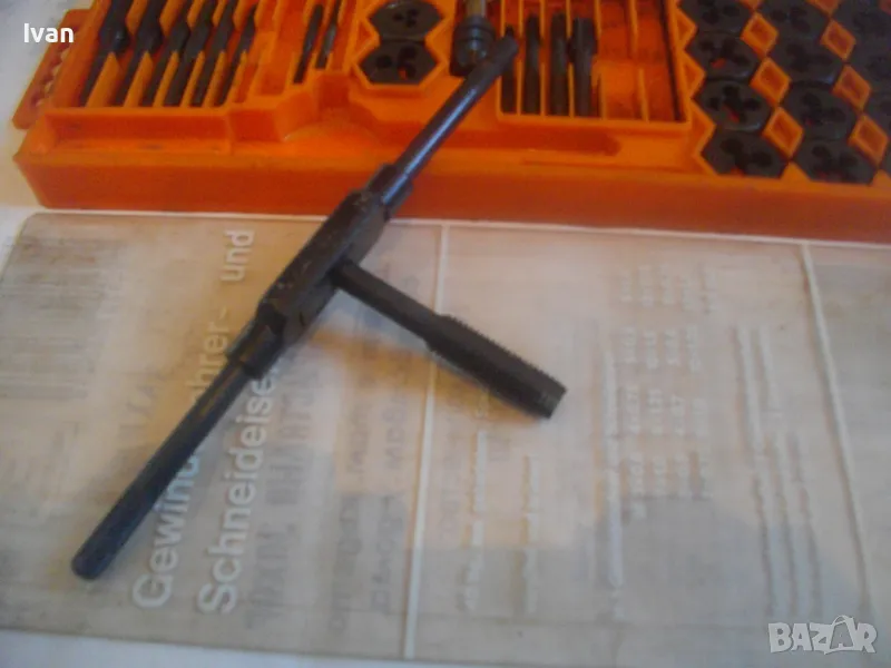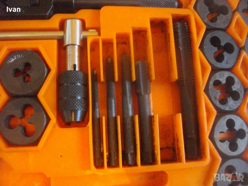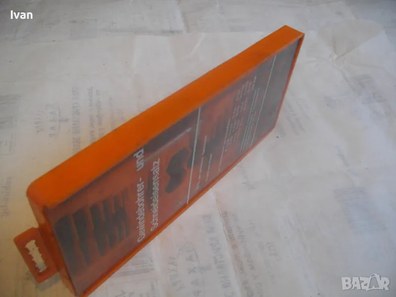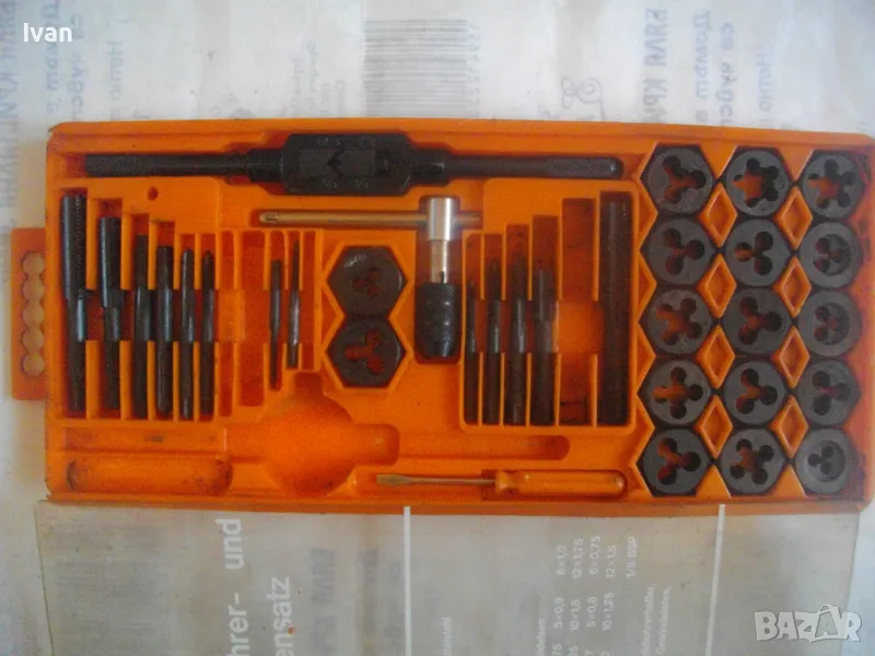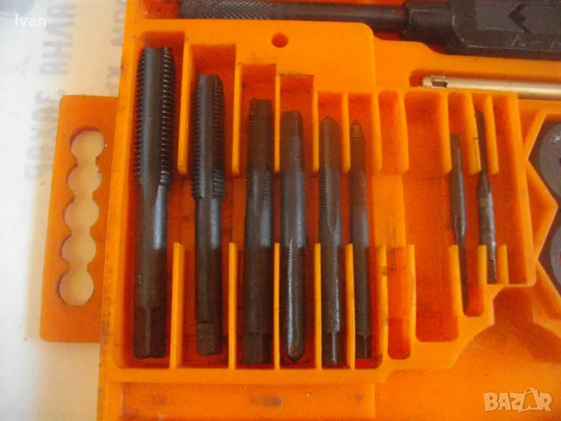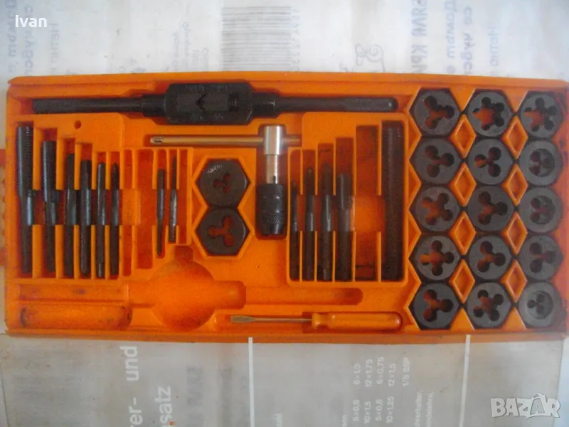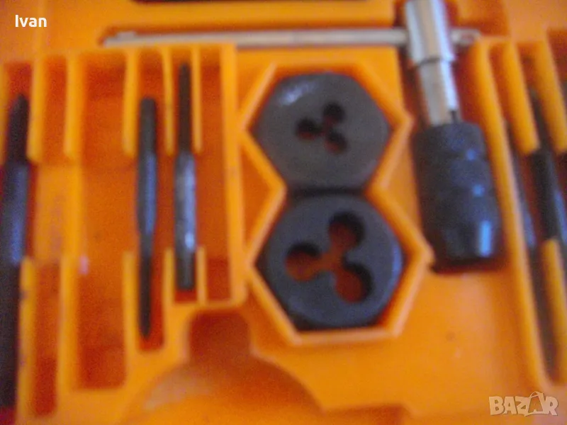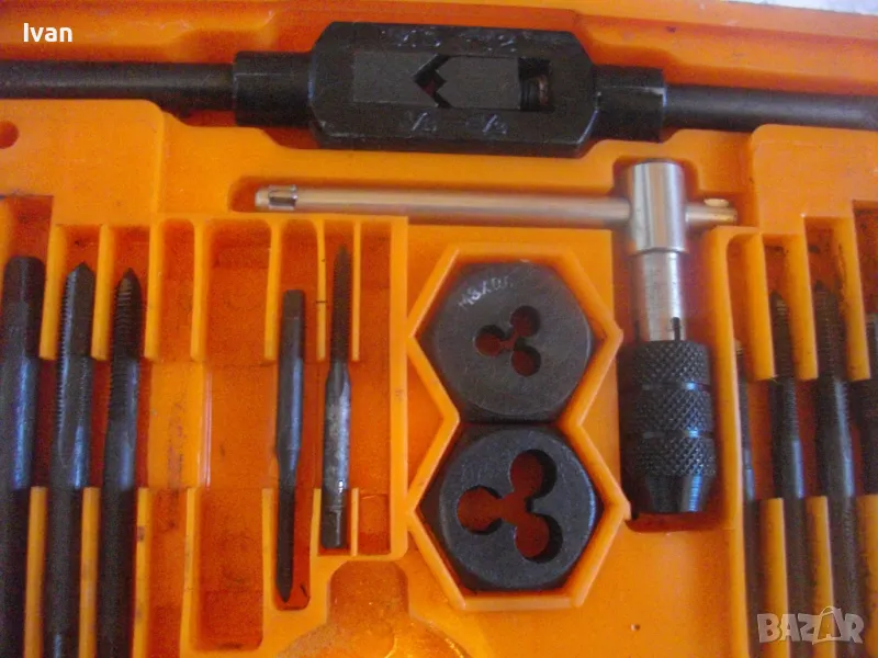 плашките и метчиците. Непълен комплект - липсва единия държач за плашките и 5 бр. метчици. Комплекта в предлагания вид включва: 17 бр. плашки М3 до М12, 12 бр. метчеци различни, държач за метчиците с дръжки, 1 бр. дорникова глава в вградена цанга за метчиците с върток, 1 бр. права отверка малка. Компонентите са от закалена студено валцована инструмеентална стомана. Кутия с прозрачно лице и вградена вложка, с дръжка за окачване.