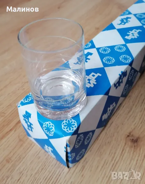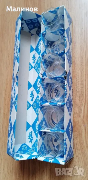 Чаши за ракия, стъклени, тънки, орнаментирани с бяла спираловидна линия, запазен комплект 6 броя в оригиналната им опаковка.
