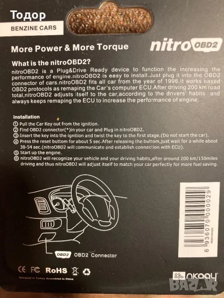 Nitro OBD-2 е чип тунинг бокс, който се включва в OBD-2 буксата на автомобила и по този начин се получава информация от компютъра на автомобила и чрез получените данни Nitro OBD-2 настройва количеството гориво, времето на инжектиране и налягане, за да се увеличи мощността на Вашият автомобил.