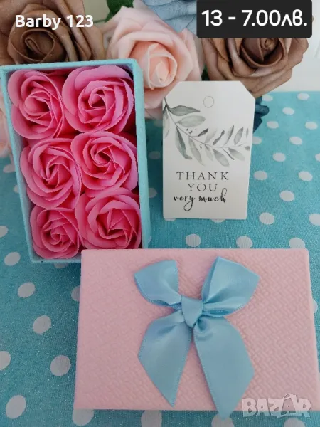 Кутийки с ароматни сапунени рози с картичка.