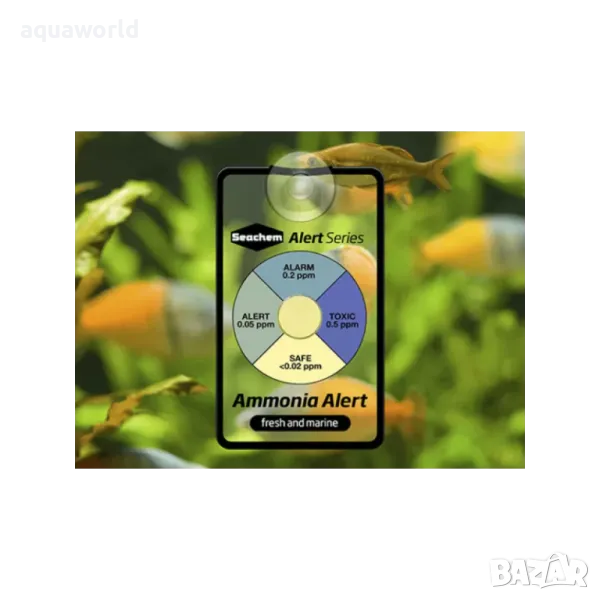 Аmmonia Alert™ е иновативен цветен тест за непрекъснато откриване и наблюдение на токсичния свободен амоняк. Сензорът му променя обратимо цвета си от жълт през зелен до син спрямо концентрацията на амоняк в тествания аквариум. Не са необходими никакви допълнителни тестове, химикали или процедури. Продуктът засича по-малко от 0,05 мг./литър (PPM) свободен амоняк и ви предупреждава навреме за убиец №1. Действието му продължава до една година. Подходящ е за употреба, както в сладководни, така и в морски аквариуми. Той трае до девет пъти по-дълго, отколкото конкурентните продукти (година в сравнение с 4-6 седмици). Аmmonia Alert е малък, ясен и ненатрапчив, така че няма да отвлича вниманието от вашия аквариум. Не се изисква допълнителна поддръжка на продукта, освен премахването на водораслите с чиста и мека материя. Избягвайте да докосвате сензора с пръсти, тъй като естественото кожно омазняване може да го повреди. Да не се използват белина, сапун, перилни препарати или твърди предмети за почистване на сензора. Някои оцветяващи лекарства могат да променят цвета на сензора.