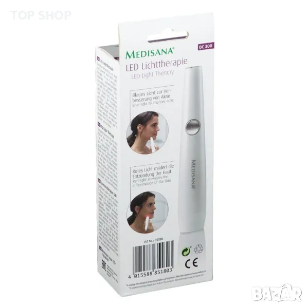 Писалка за фототерапия против акне Medisana DC 300 – Две фототерапии в едно устройство! Модела одигурява светлинна терапия, която е клинично тествано анти-акне лечение, което се предлага и в дерматологични практики. Тя се основава на взаимодействието на червени и сини светлинни лъчи, които леко проникват в кожата и се допълват перфектно. Докато синята светлина, с антибактериалния си ефект, се бори с бактериите, които причиняват акне, червената светлина намалява инфекциите и подпомага подмладяването на кожата. Прилагането на два пъти по пет минути на ден вече е доказано ефективно.