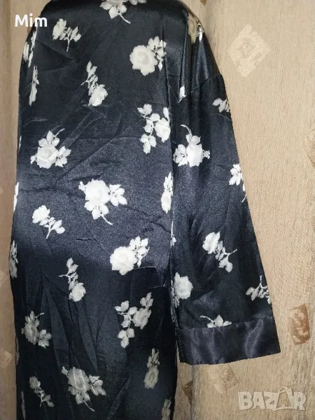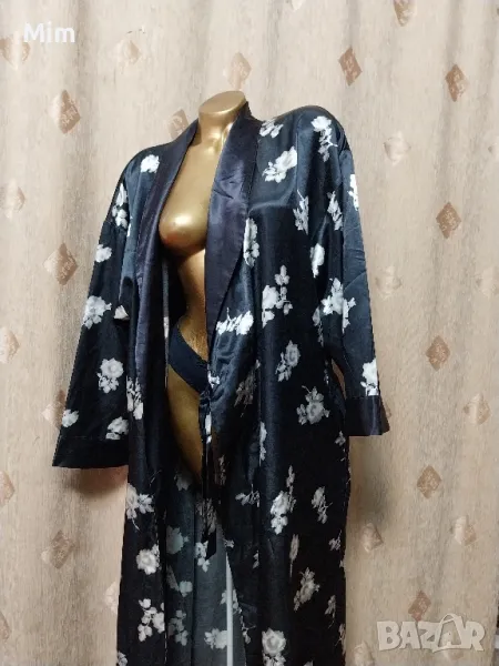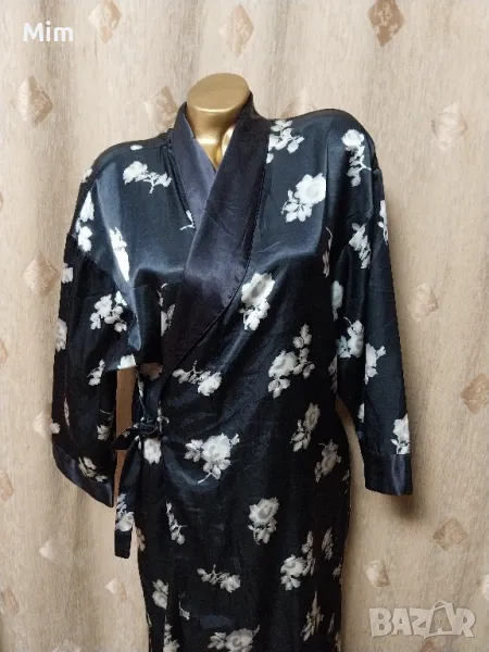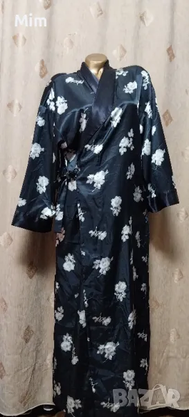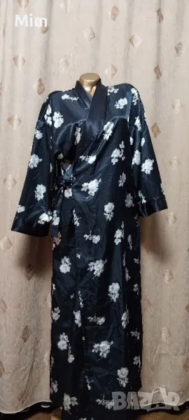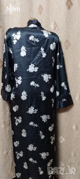 Черен сатенен халат на бели цветя, подгръдна 60 см едностранно, ханш, 67 см едностранно с премятането, дължина 140 см ,дължина на ръкавите 46 см ,с два вътрешни джоба, с гайки за колан Няма забележки