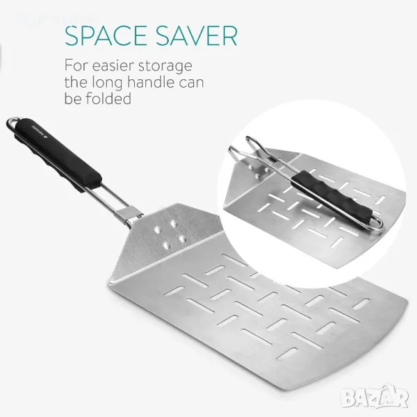 Спестяване на място: тъй като сървърът за пица може да се сгъва удобно, шпатулата може да се съхранява в отделение за прибори за хранене, за да спестите място. Или можете да окачите повдигача върху работната си повърхност благодарение на отвора на дръжката.