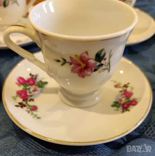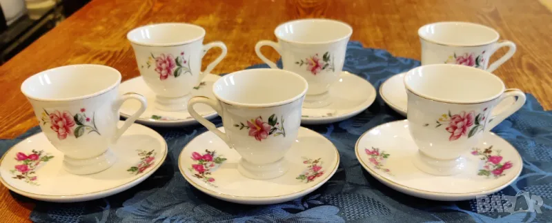 Комплект от 6 чаши с чинийки. Китайски фин порцелан. С маркировка за произход. Цена на една чаша с чинийка 20 лв. Цена на комплекта 100 лв.