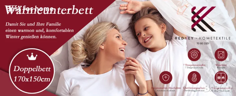 REDKEY Голяма ел. одеяло с две зони автоматично изключване, 170 x 150 см, Електрическо одеяло под легло, 2 температурни зони, Отопление под легло със 7 температурни нива, Защита от прегряване, Може да се пере