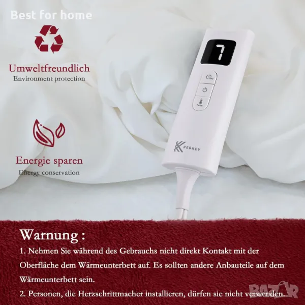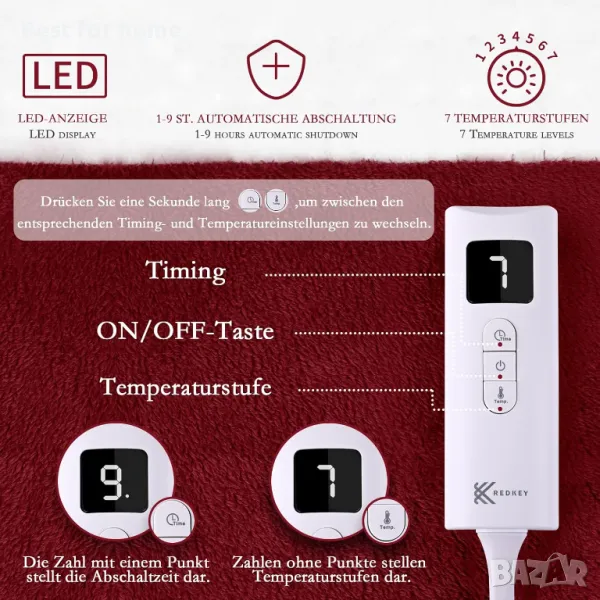 Гъвкава настройка: нашето термично легло има 7 температурни настройки, 9 времена за автоматично изключване (1-9 часа). и две независими температурни зони. Натиснете продължително бутоните "Време". и "Темп." за около две секунди, за да превключите между функциите за температура и време. Той ви помага да пестите енергия и е най-подходящият метод за отопление за вас (2 x 66 W).