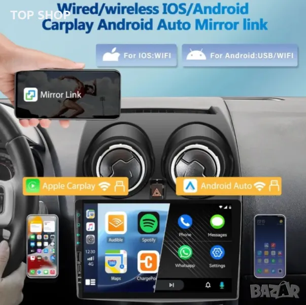 Безжичен carplay и автомобил с Android: можете да изберете кабелна или безжична връзка с Carplay, да се свържете с мобилния телефон на Apple, да получите достъп до адресната книга на мобилния телефон, имейл, известия, навигация по карти, музика, видео и друга информация и да извършвате гласов контрол . Автомобилната система Android може тясно да интегрира Android телефона на потребителя и плейъра, за да реализира същата функция като Carplay.