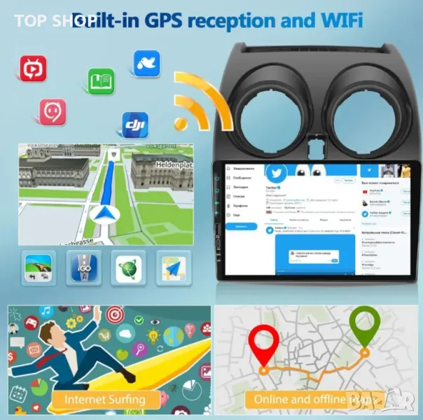 WiFi, GPS навигация: След като се свържете с WiFi, можете да изтегляте различни приложения към радиото. Можете да слушате музика онлайн и да гледате видеоклипове "YouTube". Той е практичен като голям смартфон и внася забавление в пътуването. Радиото е съвместимо с Waze/Navfree/Google Maps и др. Благодарение на вградената функция за GPS навигация, можете да изтеглите офлайн навигация директно от Play Store или да използвате онлайн картите на Google.