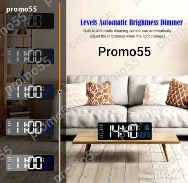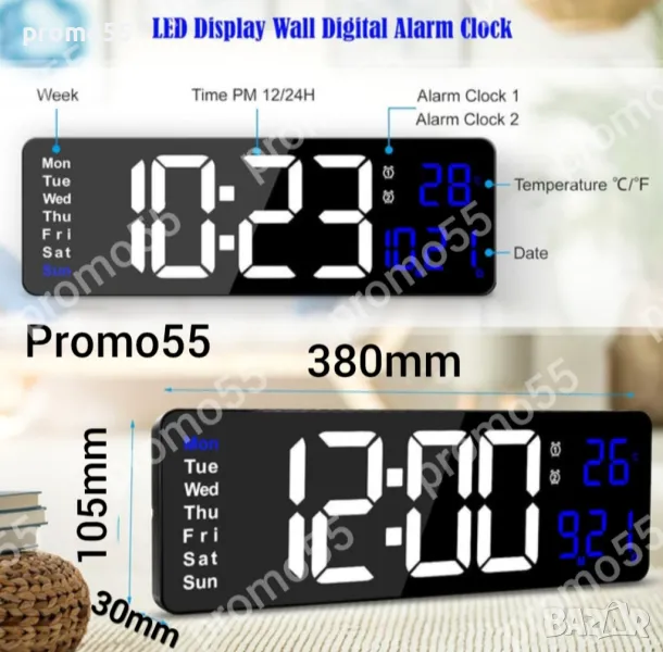 Стенен часовник или настолен часовник с олям и ярък LED дисплей, осигурява лесна видимост на часа от всяка страна на стаята, премахвайки нуждата от присвиване или напрягане, регулируема яркост и дистанционно управление, всички настройки могат да се правят чрез дистанционното.