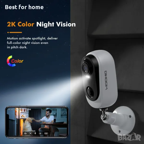 1080P Live Vision & Color Night Vision Външната камера за сигурност DIHOOM е оборудвана с 1080P HD резолюция и 3MP пиксела, за да ви предостави ясни снимки и видеоклипове, можете да гледате кадри на живо дистанционно на вашия телефон или таблет по всяко време. Камерата за сигурност поддържа цветно нощно виждане. Когато се открие движение през нощта, камерата автоматично включва топлата светлина, за да заснеме цветни изображения или видеоклипове.