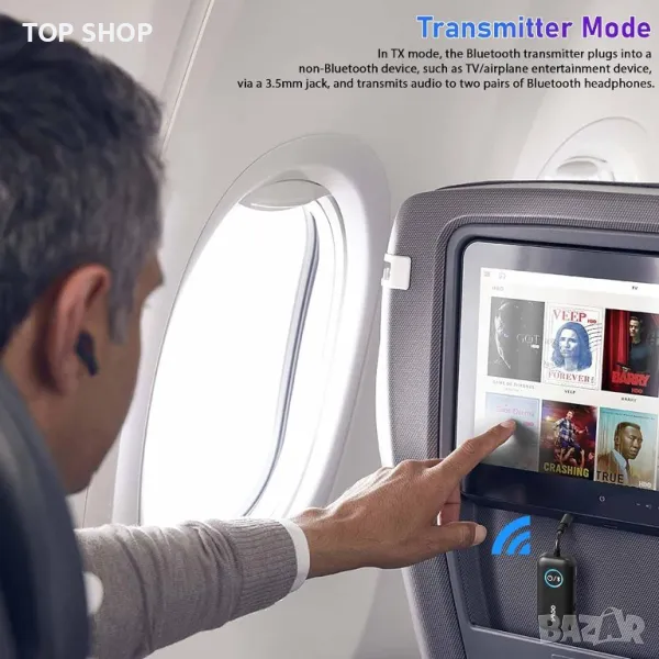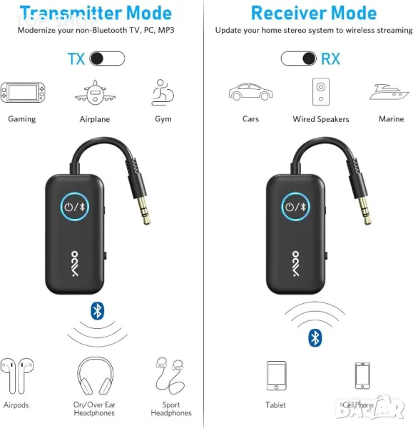 В режим TX, Bluetooth предавателят се включва в устройства без Bluetooth, като телевизия/развлечение в самолет чрез 3,5 mm жак, и предава аудио към Bluetooth слушалките; В режим RX, Bluetooth приемникът може да бъде свързан към входен порт за кабелен високоговорител/автомобилен аудио вход и да получава аудио от смартфон чрез Bluetooth.