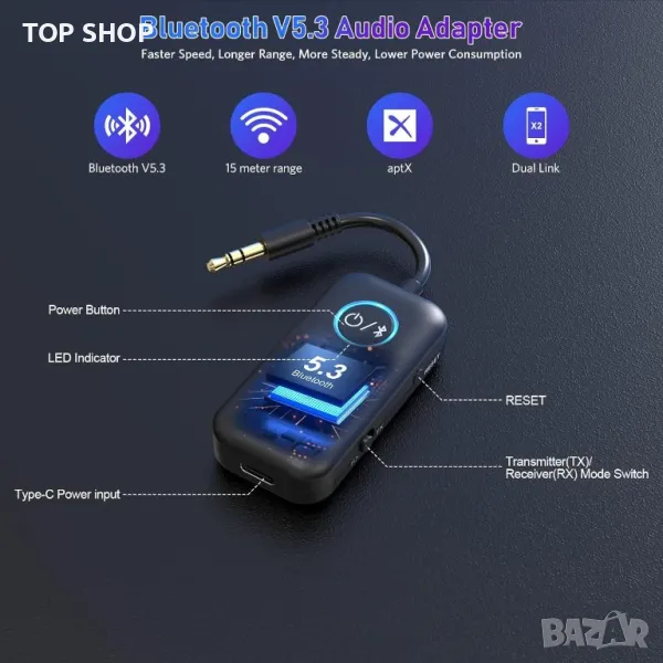 Bluetooth аудио адаптер YMOO, оборудван с Bluetooth 5.3 чип и най-новия контролен чип на Qualcomm. Поддържа SBC/MP3/AAC/aptX/aptX-LL/aptX-HD/aptX-Adaptive и т.н. Bluetooth аудио кодиращ протокол, предлага мощен формат за декодиране, възстановява висококачествен стерео звук на ниво CD.