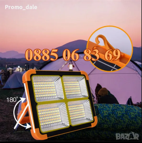 Соларна къмпинг лампа 100W, притежава акумулаторна батерия 16500mAh 10000 LM с безстепенна яркост с режим за аварийна работна светлина за бедствие.