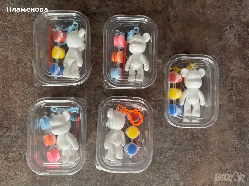 Един комплект съдържа: Меченце ключодържател + лъжичка, четчица и 3 цвята боички