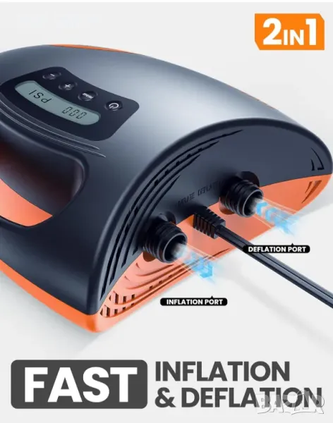 Бърза и мощна двустепенна и автоматично изключване за лесно надуване: Автоматична двустепенна помпа: 1-ва степен за максимална скорост при 350l/min и 2-ра степен за максимално налягане при 70l/min. Функцията за автоматично изключване изключва помпата при достигане на целевото налягане при надуване. Когато опаковате, функцията за обезвъздушаване ще направи изпускането бързо и лесно.
