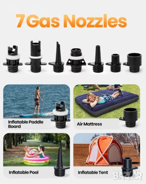 12v dc конектор за кола и пълен комплект приставки за дюзи: Свързва се към 12v dc конектор на вашия автомобил. Разполага с предпазител 12a за повишена безопасност. Предлага се с пълен набор от дюзи, за да пасне на повечето надуваеми лодки с високо налягане, включително c7 и h3 клапан.