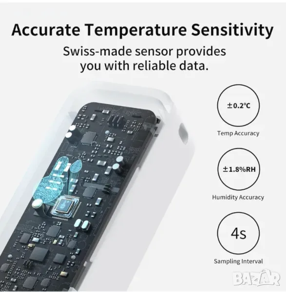 Чувствителен към промените в температурата и влажността: С вграден индустриален сензор Swiss Sensirion можете да очаквате точност до ± 1,8% RH, ± 0,2 °C/0,36 °F, с бърз и точен интервал на вземане на проби от 4 секунди до непрекъснато следете температурата и влажността в околната среда.