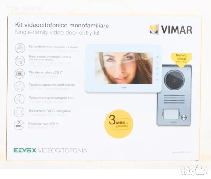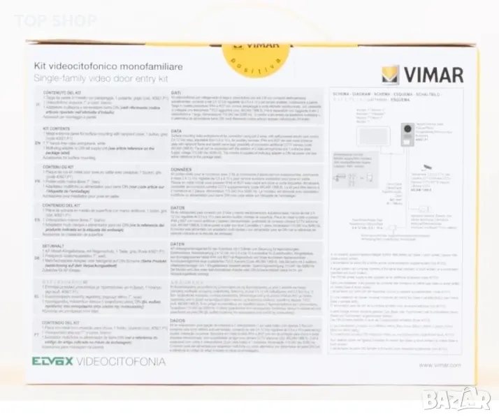 Vimar k40910 комплект за стенен видео домофон, съдържащ 1 7˝ LCD цветен видео домофон със сензорен бутон за свободни ръце, 1 аудио-видео панел, 1 бутон с рамка за дъждобран, 1 24 VDC 1 A захранване с европейски, британски, американски и австралийски стандарт сменяеми тапи, окомплектовани със скоби за стенен монтаж.