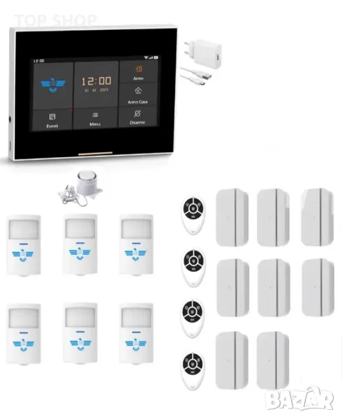 ✅ КОМПЛЕКТЪТ включва: 1 FUTURA GSM + WIFI безжичен алармен контролен блок, 1 вътрешна жична сирена, 4 433 Mhz безжични дистанционни управления, 6 сензора за движение, 7 магнитни сензора за врати/прозорци