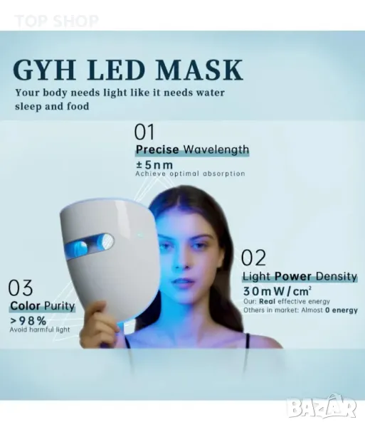 Оптимизирани дължини на вълните: В GYH прецизността е от първостепенно значение в светлинната терапия. Нашата LED маска за лице използва първокласни лампи, които излъчват светлина със забележителна точност на дължината на вълната от ±5nm, осигурявайки прецизно прилагане на лечението за максимални ползи за кожата. Ключовите дължини на вълните включват 820 nm за близка инфрачервена светлина, 630 nm за червена, 465 nm за синя и 520 nm за терапии със зелена светлина, оптимизирайки ефективността на всяка сесия.