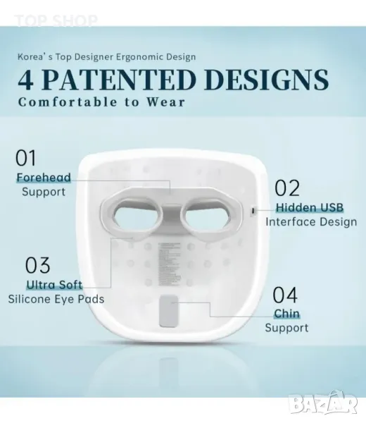 Уникален патентован дизайн - GYH LED маската има патентована уникална силиконова опора за маска за очи, която предпазва очите ви. Регулируема подложка за брадичката за различни форми на лицето. Тези два уникални дизайна държат маската на 1 см разстояние от кожата, така че е по-безопасна и по-чиста за използване. Това също означава, че светлината може не само да покрие перфектно лицето, но и да достигне до кожата на шията. Вградена 2000 mAh високопроизводителна батерия, тя може да работи непрекъснато в продължение на 180 минути при пълно зареждане, напълно освобождавайки ръцете ви.