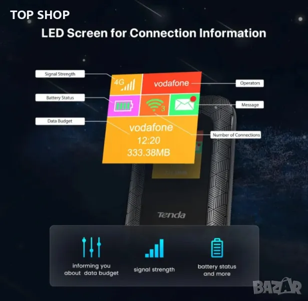 Интуитивен потребителски интерфейс за ясна и незабавна информация: Tenda 4G има малък цветен екран, който предоставя цялата необходима информация за свързване, като сила на 3G/4G сигнала, скорост на изтегляне/зареждане, състояние на батерията, обхват на Wi-Fi сигнала, как много потребители са свързани и много повече.
