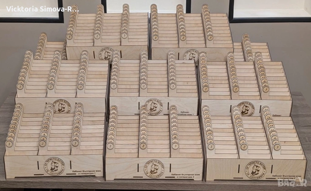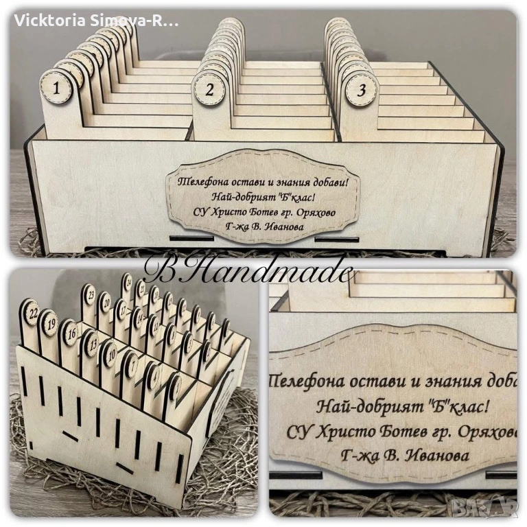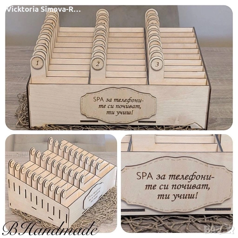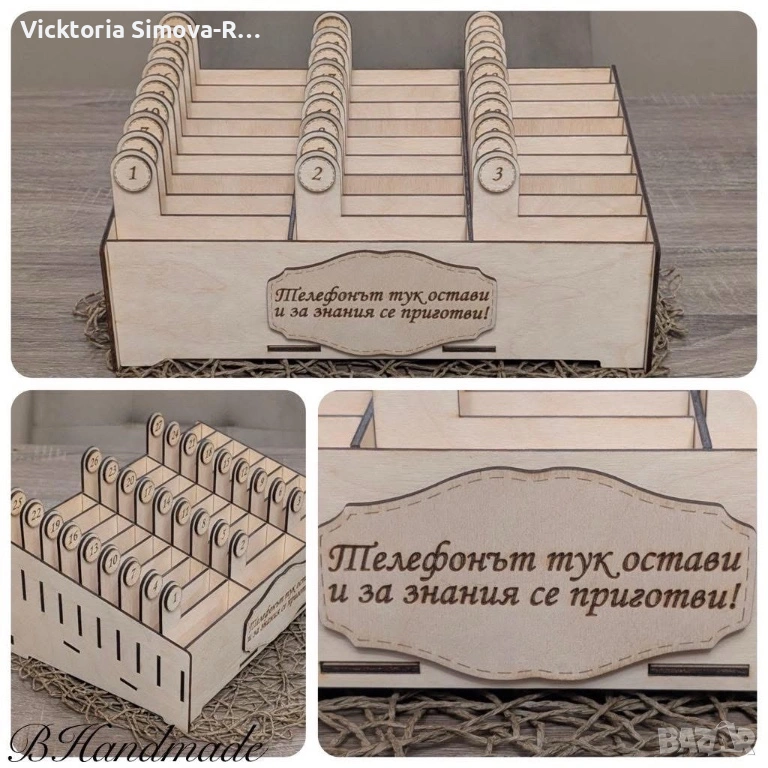 Дървен органайзер за мобилни телефони. Може да бъде изработен във вариант за 21, за 24, за 27 и за 30 броя телефони. Време за изработка около 7 - 14 дни или в зависимост от моментната заетост с поръчките и броят на артикулите, които бихте желали да поръчате.