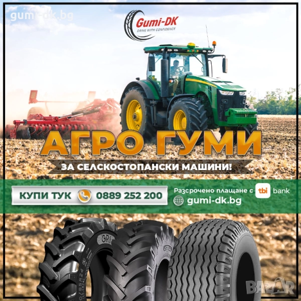 --Руски, турски, индийски, полски, украйнски гуми за трактори Беларус, Болгар, Владимировец, Кировец, ЮМЗ, Case IH, Challenger, Claas, Deutz-Fahr, Fendt, Iseki, JCB, John Deere, Kioti, Kubota, Massey Ferguson, New Holland, Pronar, Steyr, Valtra, Zetor, японски и китайски трактори и други селскостопански машин