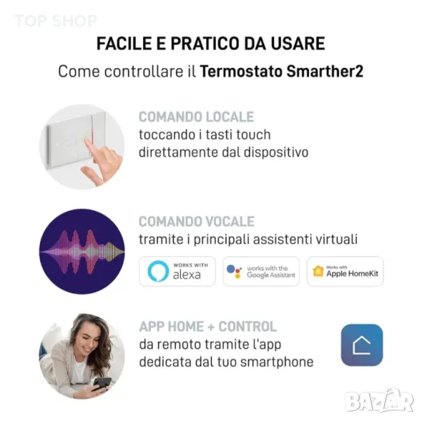 РАЗЛИЧНИ РЕЖИМИ НА УПРАВЛЕНИЕ: Този WiFi термостат може да се управлява ръчно, с Alexa, Google Home или Apple HomeKit гласов асистент или с приложението Home + Control, с което можете да конфигурирате всички устройства в гамата "с Netatmo"