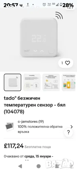 ИЗИСКВАНИЯ: Съвместим с интелигентни радиаторни термостати tado°, изисква се стартов комплект tado° (V2, V3, V3+) с интернет мост (не е включен)