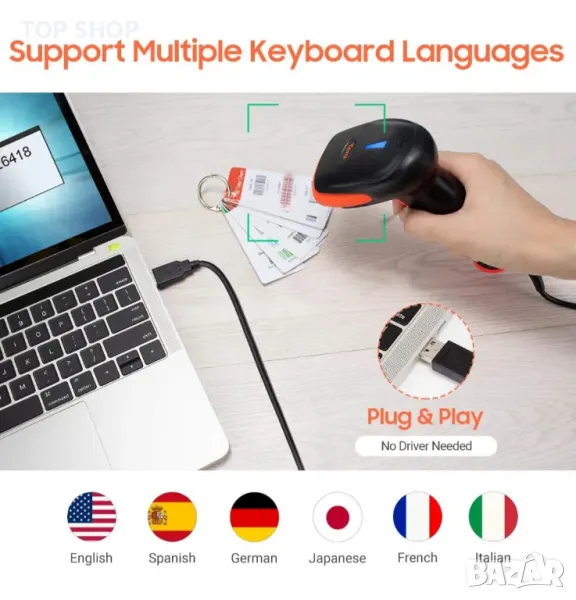 【Usb скенер --- широка съвместимост】 Поддържа Windows, Mac OS и Linux; работи с Word, Excel, Novell; и почти целия общ софтуер. Баркод скенерът Tera може да се използва широко в супермаркети, търговски центрове, козметични магазини, търговия на дребно, пощенска индустрия, логистика, банки и медицински институции. Поддържаните езици включват английски, испански, немски, френски, италиански, японски и др.