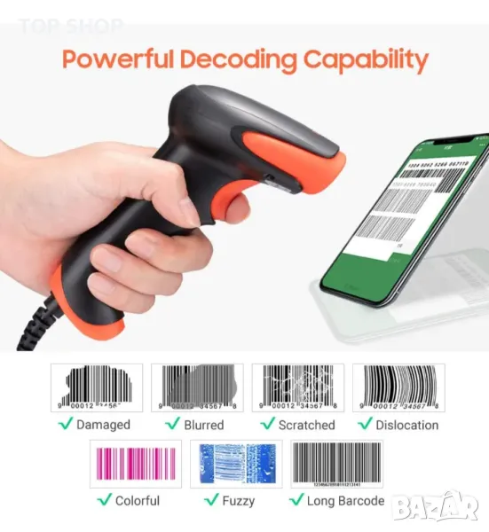 【Скенер за баркод --- Сканиране на изображение на екрана】 По същество CCD скенерът "прави снимка" на баркода, което позволява на CCD скенерите да могат да работят при ярка слънчева светлина. CCD скенерите Tera 1500C също могат да четат сканирания от екрани на компютър или други устройства бързо и точно.