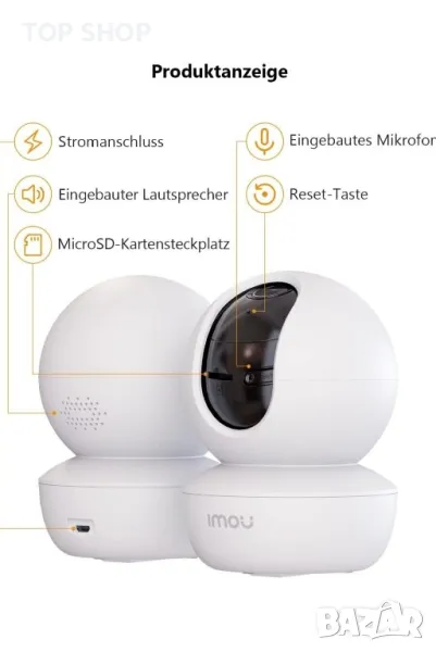 Imou Камера за наблюдение Вътрешна въртяща се 1080P IP WiFi камера AI Person Detection Нощно виждане Двупосочно аудио Съвместим с Alexa за домашни животни, Бебефон Ranger SEПрепоръчителни употреби на продуктаНощно вижданеМаркаИмоуИме на моделаRanger SEТехнология за свързванеБезжиченСпециално свойствоЛокален запис, нощно виждане, сензор за изображениеИзползване на закрито/външноНа закритоFHD 1080P 360° и нощно виждане: Камерата за вътрешно наблюдение Imou е оборудвана с широкоъгълен обектив от 3,6 mm и 1080P FHD, така че можете да видите детайли. С вертикално завъртане от 100° и хоризонтално завъртане от 355°, IMOU Ranger SE поддържа 360° панорамен изглед за наблюдение. Подобрен с инфрачервено нощно виждане до 10 метра, Ranger SE осигурява ясно видео дори през нощта. (Поддържа само WLAN 2.4G)Двупосочен звук и работи с Alexa: Ranger SE има вграден високоговорител и микрофон, така че можете да говорите с вашето бебе и домашни любимци, ако ви липсват. Съвместим с Alexa, можете да помолите Alexa да покаже стаята на вашето бебе и да се увери, че то спи добре.AI за откриване на хора и интелигентно проследяване: вътрешната камера за наблюдение на Imou може ефективно да идентифицира човешки форми в рамките на 10 м и да намали фалшивите аларми като домашни любимци и летящи насекоми. Когато Ranger SE засече движението на вашето бебе, той го проследява и записва в приложението Imou Life, така че никога да не пропускате всяко движение на вашето бебе.Откриване на необичаен шум и незабавни съобщения: Когато бъдат открити необичайни звуци, Ranger SE ви изпраща незабавно предупредително съобщение на вашия телефон. Когато бебето ви плаче или кучето ви лае, можете незабавно да забележите и да реагирате, дори когато не сте у дома.Режим на памет и защита на данните: Вътрешната камера за наблюдение Imou има 3 метода за съхранение: SD карта, NVR и съхранение в облак. Тази Micro SD карта поддържа до 256 GB. Всички камери Imou са съвместими с Onvif и ви предлагат безплатен облак за 30 дни, за да се насладите на най-безопасното съхранение. За да защити вашата поверителност, Ranger SE има физически екраниран дизайн. Можете да преместите обектива на камерата надолу чрез приложението, което е по-надеждно.