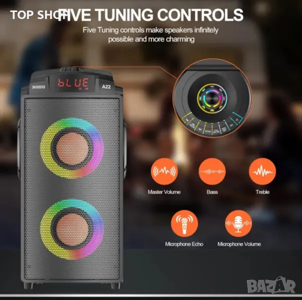 【Технология за богат бас и 5 контрола за настройка】 Парти високоговорителите BOHINI са оборудвани с най-новата бас технология. Работете чрез основния бутон за избор и високоговорителят ще издаде мощен звук, който ще изпълни партито с музика. Освен това поемете контрола с копче за регулиране на силата на звука, което ви позволява да настроите фино вашето звуково изживяване до съвършенство.