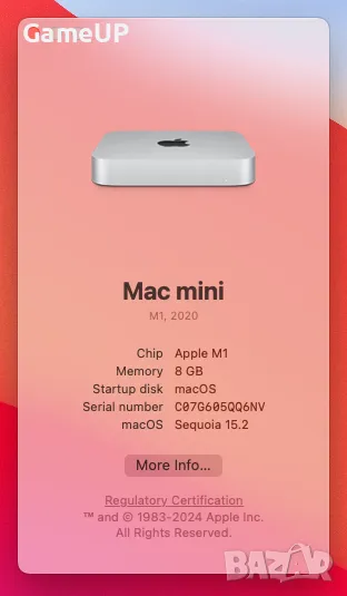Продавам Mac Mini M1 8GB RAM / 256GB SSD в перфектно състояние и неразличим от нов. Без драскотина и следи от употреба, напълно обслужен, без никакви забележки и ъпгрейднат до последната версия на macOS. Напълно безшумен, лек и компактен и с изключително ниска консумация на ток(средно между 5 и 10 вата на час). В комплект с оригиналната кутия, зарядно и абсолютно всичко, точно както е закупен.