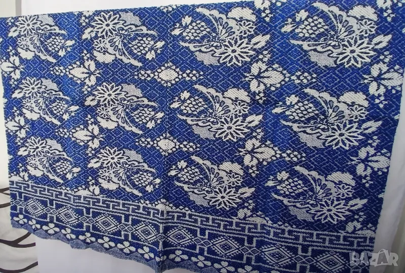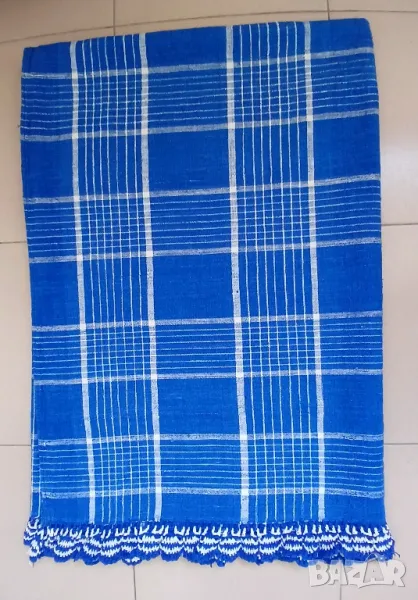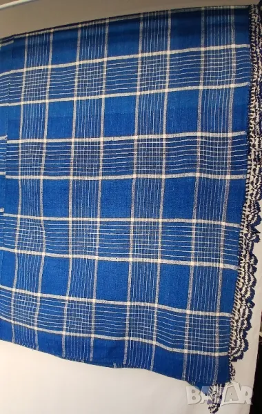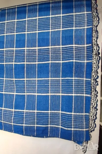 Памучен цветен чаршаф от времето на Соца, ръчно тъкан от 100% памук. Нов не ползван. В разцветки синьо и бяло на квадратчета. Чаршафа става за персон и половина и за единично легло, от едната страна има ръчно изплетена дантела.