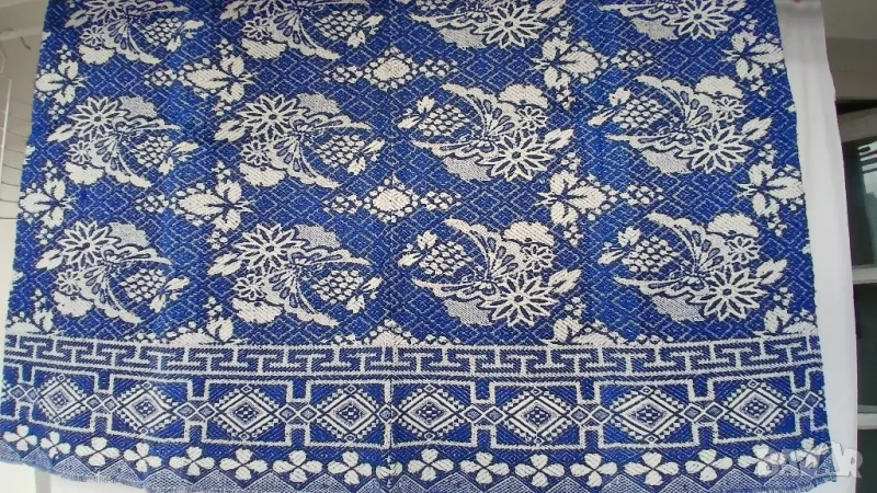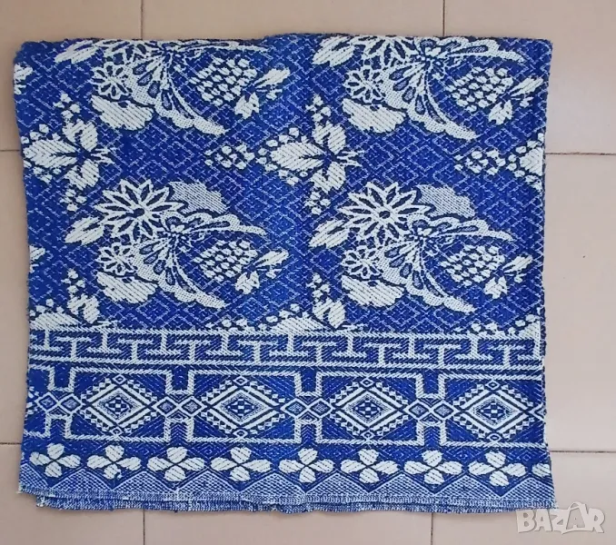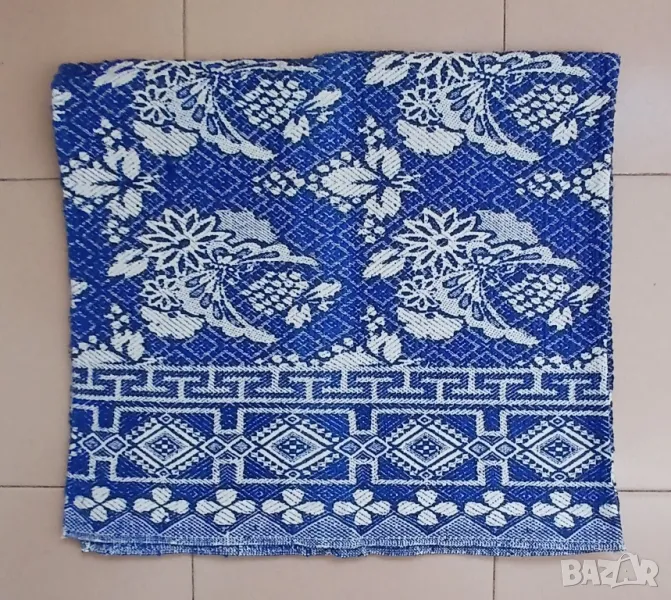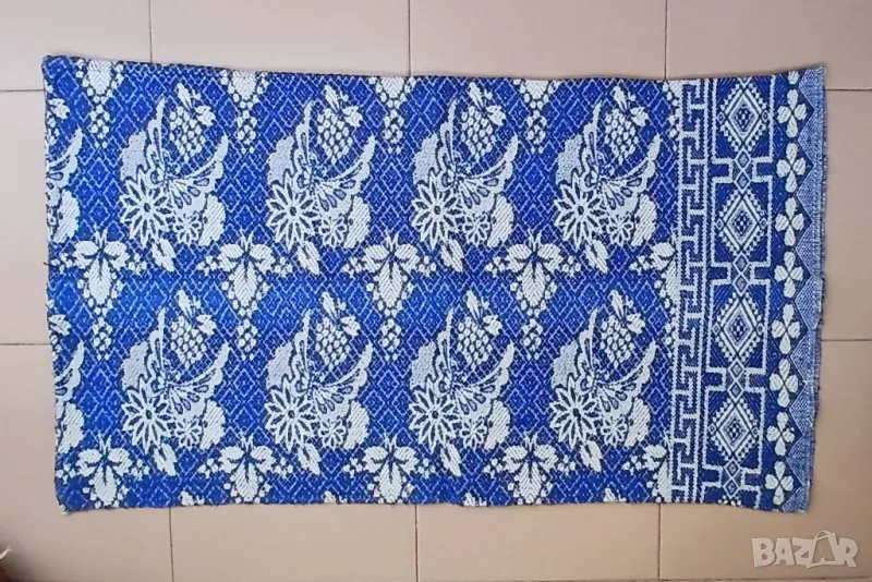 Ръчно такано малко килимче който може да намери различно приложение в домашния бит, дори и да се поставя под болен човек, да бъде застлано на фотьойл и други приложения. Изработено ръчно от 100% памук. Плътно и мекичко, в разцветка синьо и бяло на цветя. Ново не ползвано.