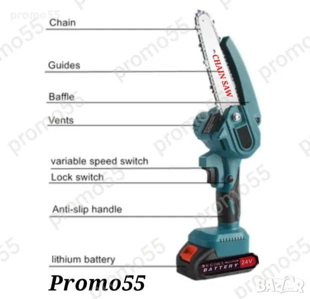 БАТЕРИЯ С ГОЛЯМ КАПАЦИТЕТ - електрическият трион е оборудван с акумулаторна 24V литиева батерия, която осигурява удължено време за използване, бързо зареждане и елиминира неудобството от честа смяна на батерията.