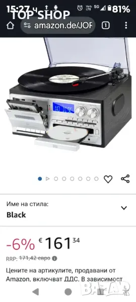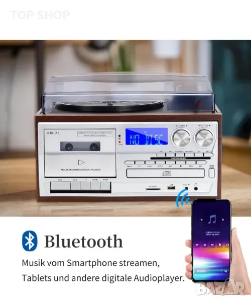 Ретро грамофон JORLAI 9-в-1 с Bluetooth,CD,касета,AM/FM радио,USB/SD запис,Aux вход,RCA изходи