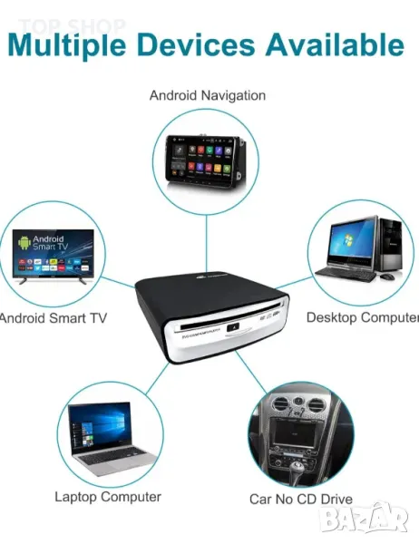 【Множество дискови формати】CD плейър използва усъвършенствана технология, поддържа CD-ROM, CD-R, CD-RW, DVD. (Телевизори и автомобили трябва да поддържат възможността за четене на USB флаш устройства, преди да могат да използват това устройство за възпроизвеждане на CD. Устройството използването на оптичното устройство трябва да има плейър, способен да поддържа формата на възпроизвеждания диск.)